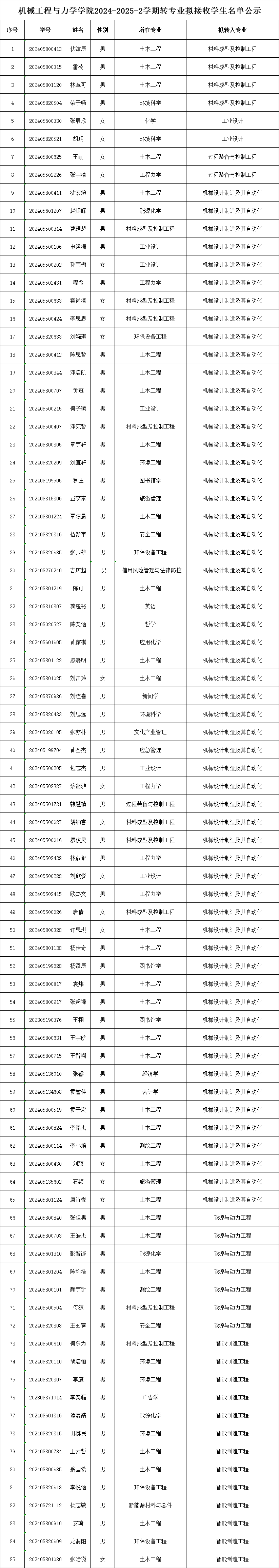 根据《湘潭大学本科学生学籍管理规定》(湘大教发〔2017〕21 号)、《六合彩官网-香港六合彩官网资料 本科生转专业实施办法》等文件,学院对申请转专业的学生进行资格审查、综合面试考核,拟同意接收伏津辰等 85 名学生转入六合彩官网 相关专业,具体名单如下: